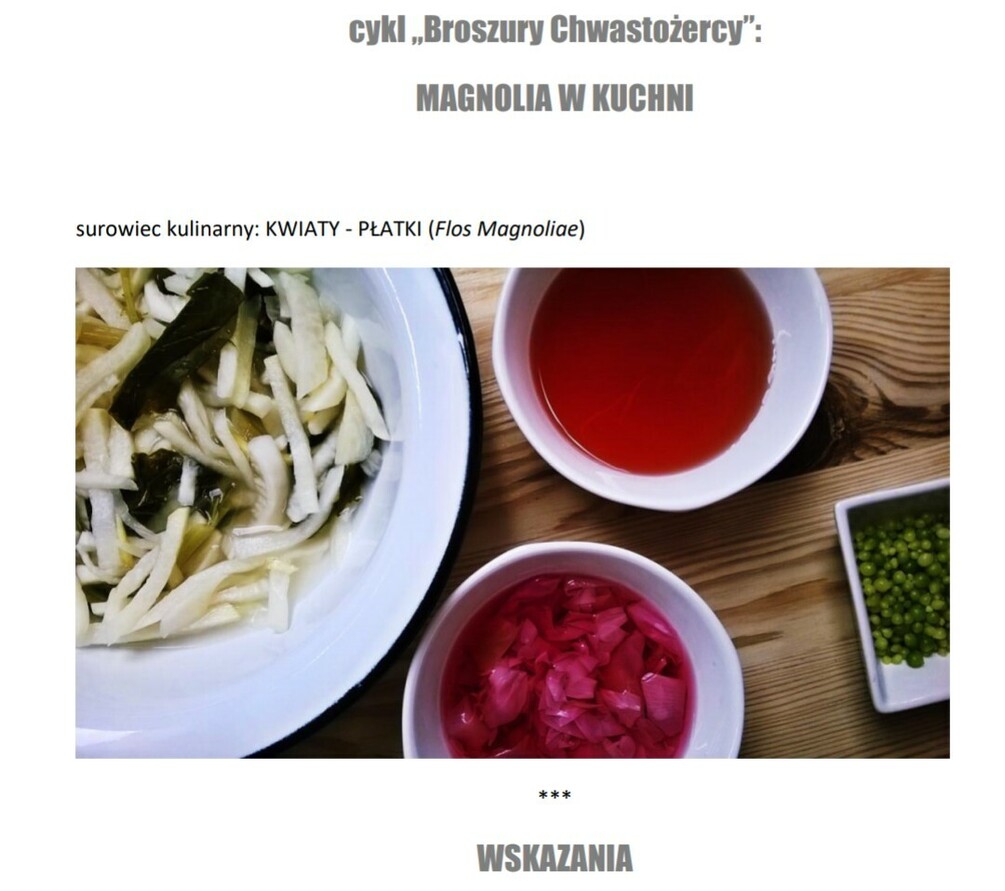 Podręcznik o kulinarnym wykorzystaniu kwiatów magnolii; koncepcji kulinarnych, A4, barwne ilustracje.